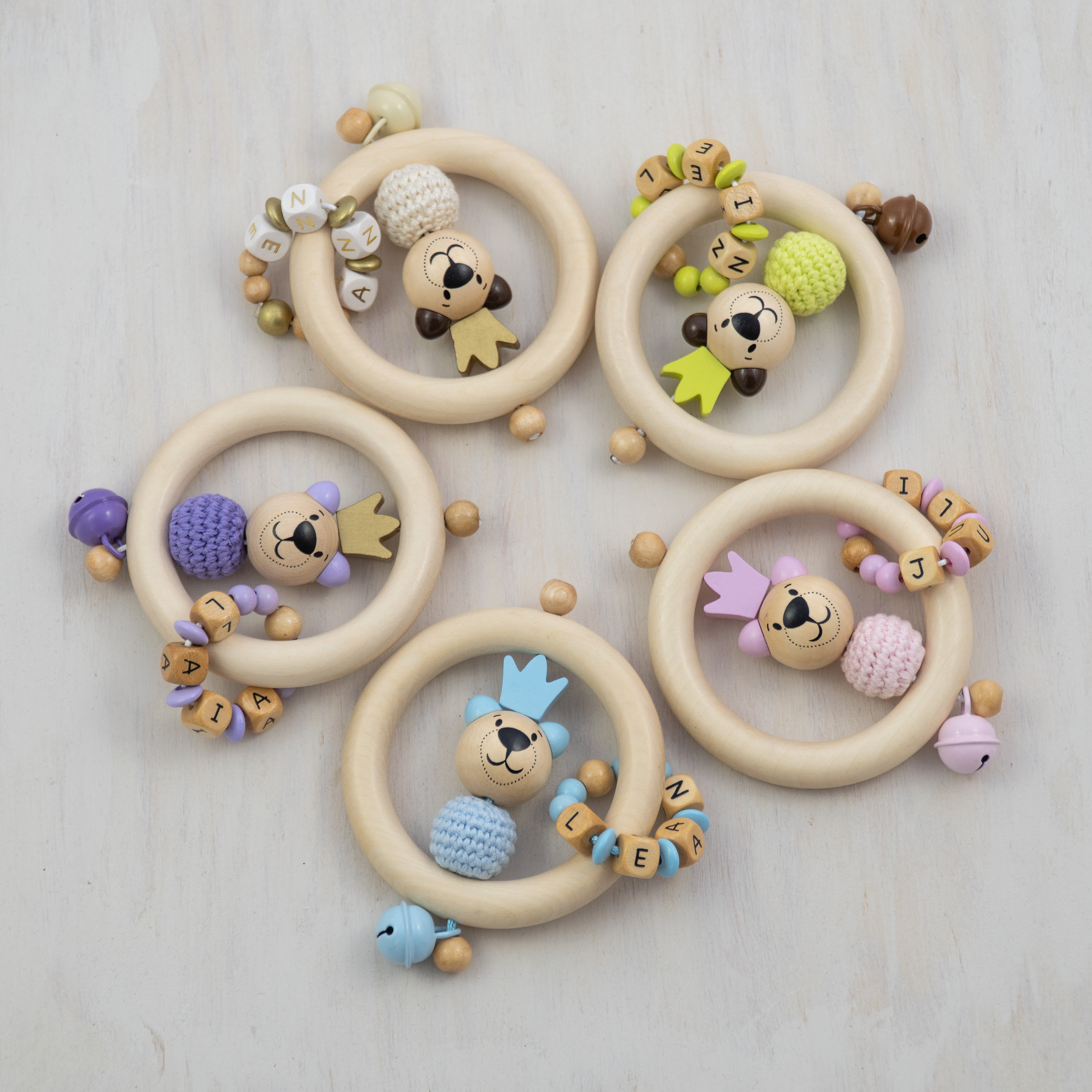 Weiter geht es mit dem Namens-Kettchen: Fädle alle Perlen in der gewünschten Reihenfolge auf die übrig gebliebene, abgeschnittene Kordel. Achte darauf, dass die Perlen auf der anderen Seite nicht wieder abrollen. Lege das Kettchen um den Greifling und verknote es mit einem festen, doppelten Knoten vor der großen Öffnung der Sicherheitsperle. Verschweiße den Knoten vorsichtig mit einem Feuerzeug, versenke ihn in der Perle und überprüfe abschließend die Reißfestigkeit des Namens-Kettchens.
