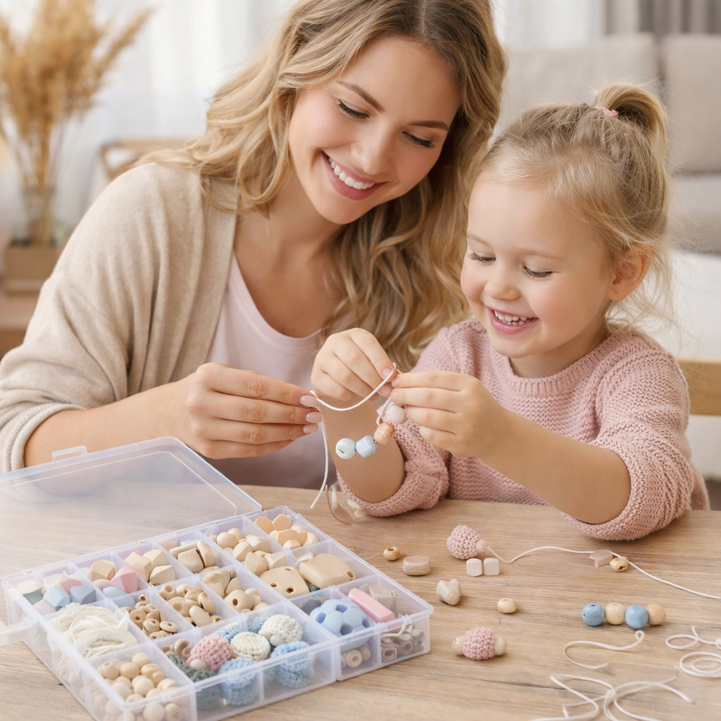 Here you will receive a lovingly put together craft box/starter set for making pacifier chains. This makes it easy to make your own pacifier chains.The starter box comes in colorful shades and contains everything you need to get off to a good start making baby toys or pacifier chains.This starter box also makes a wonderful baby gift. ❤️Contents of the pacifier chain starter box:1 sorting box50 wooden beads (10mm)50 wooden lenses (10mm)3 hexagon beads (16mm)4 safety beads (10mm)2x 0.5m PP cords 1.5mm5 plastic letters of your choice2 mini clips (30mm) in yellow, medium blue4 motif beadsRocket" motif bead"Butterfly" motif beadStar" motif beadFlower" motif beadHigh-quality woodwork (maple) from German production!This product is designed for the manufacture of pacifier chains, baby carriage chains and mobiles for babies. It therefore complies with the DIN EN 71-3 standard (new standard for migration of certain elements).All motif beads are sweat-proof, saliva-proof and color-fast.ATTENTION: THIS STARTER BOX IS NOT SUITABLE FOR CHILDREN UNDER 3 YEARS OF AGE DUE TO SMALL PARTS THAT CAN BE SWALLOWED! (individual parts)
