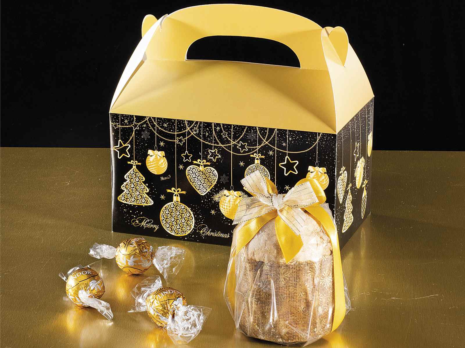 Weihnachtsboxen aus goldfarbenem, schwarz-weißem Weihnachtspapier mit Henkel. Ideal zum Verpacken von Geschenken, Süßigkeiten und Lebensmitteln. Perfekt für eine elegante und praktische Verpackung für die Feiertage.