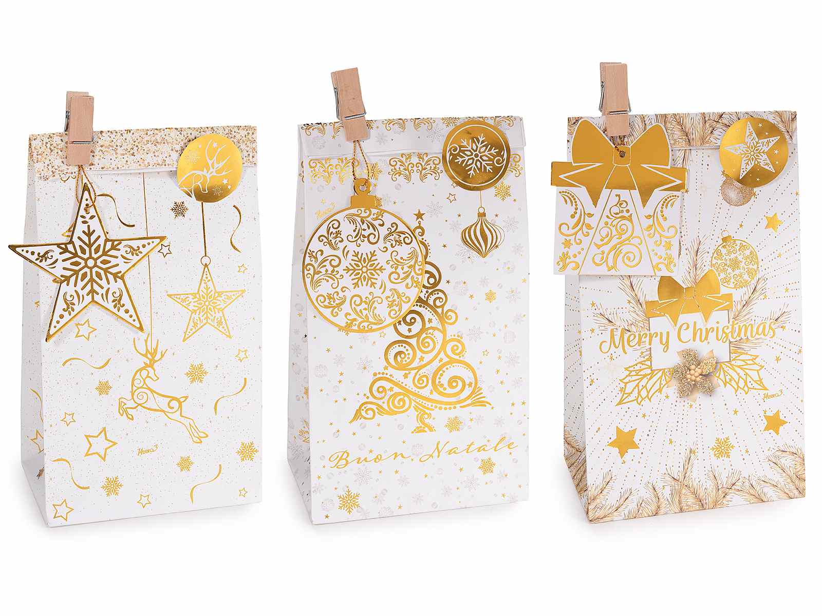 Weihnachtspapiertüte Gold mit Clip, Anhänger und Aufkleber